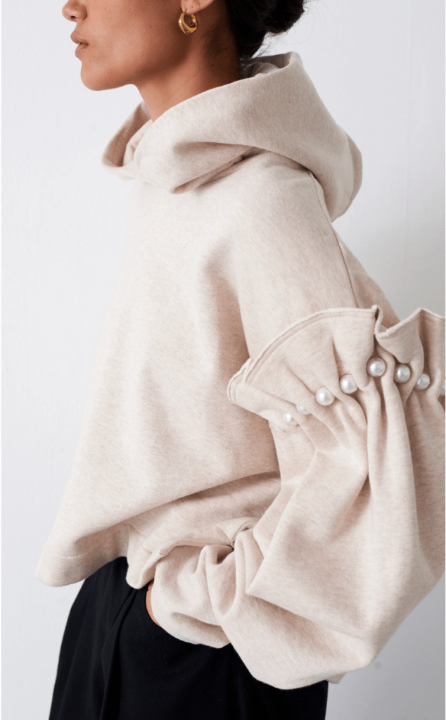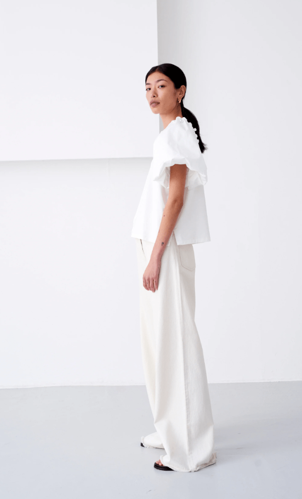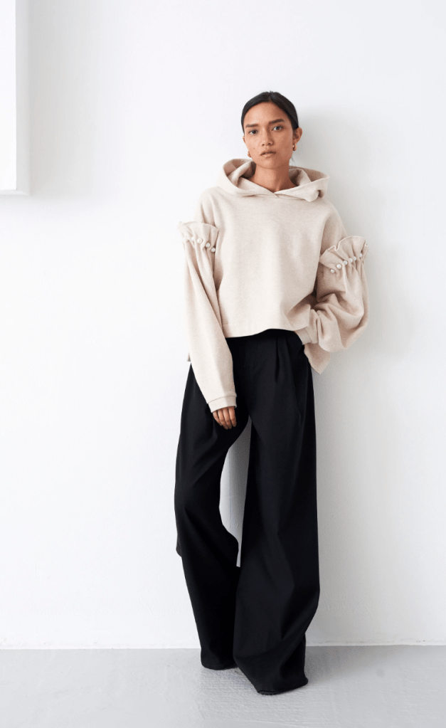Amy’s No Frills collection leaves no gaps in the supply chain. Being both fully sustainable in production and being elegant is impressive. I love how the sleeves are redefined with almost a shell-like ruffle at the arms. The pearls add a touch of elegance.